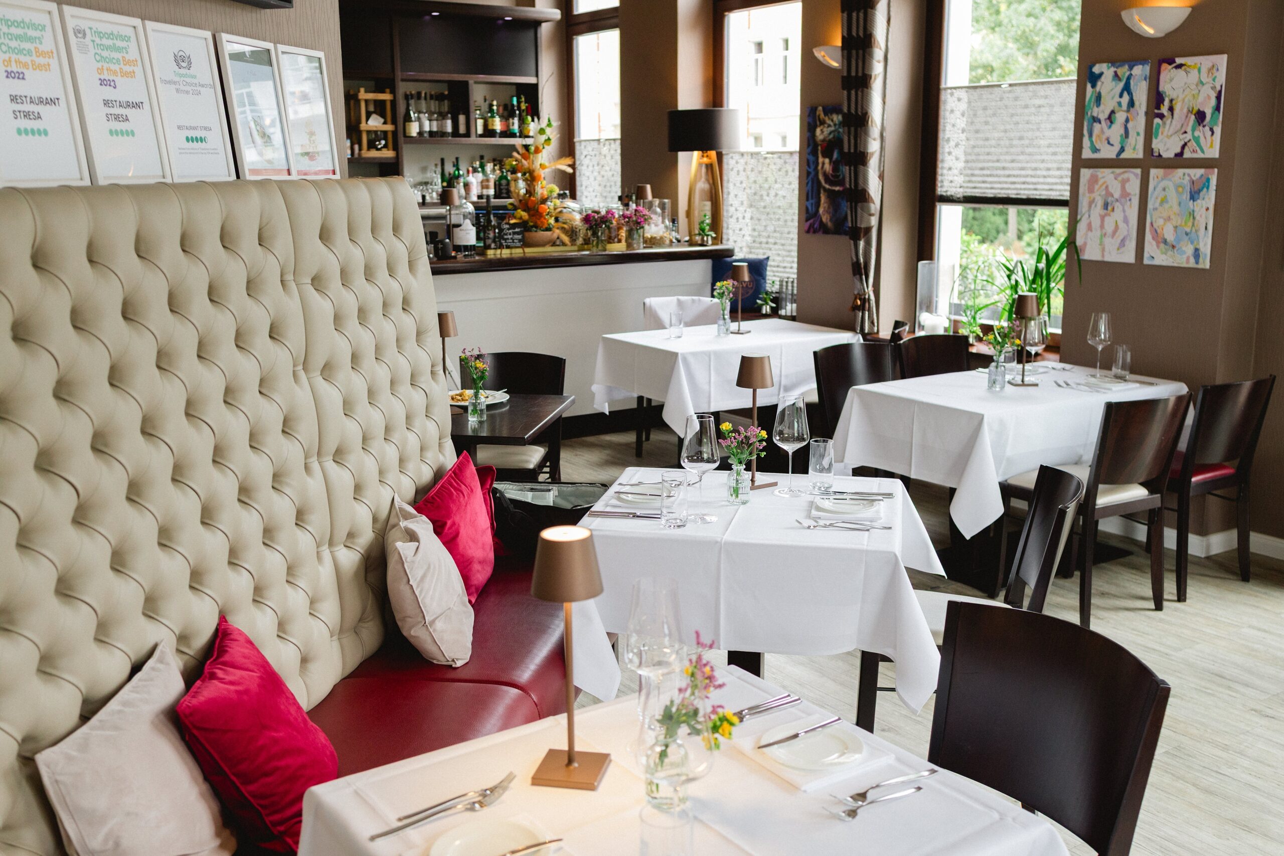 Wer unser STRESA besucht, wird von einem schönen Haus aus der Gründerzeit mit einer vorliegenden, liebevoll hergerichteten Terrasse empfangen. Im Inneren erwartet Sie auf knapp 100 Quadratmetern ein elegantes und dezentes Ambiente mit Platz für bis zu 70 Gäste. Das „Herzstück“ aber ist unsere offene Küche. Sie gewährt Ihnen einen Blick auf das Treiben unserer Köche. Dabei bereiten wir alle Gerichte immer frisch zu. Wir backen unser Brot selbst und auch unsere Pasta ist hausgemacht. Welche Gerichte – ob klassisch, vegetarisch oder vegan – es final auf die Speisekarte schaffen, beeinflusst hauptsächlich die Saison. Produkte regionaler Hersteller dürfen dabei nicht fehlen. Gleiches gilt für unsere Weinkarte, denn die edlen Tropfen aus den sächsischen Weinbergen werden sehr gern getrunken.